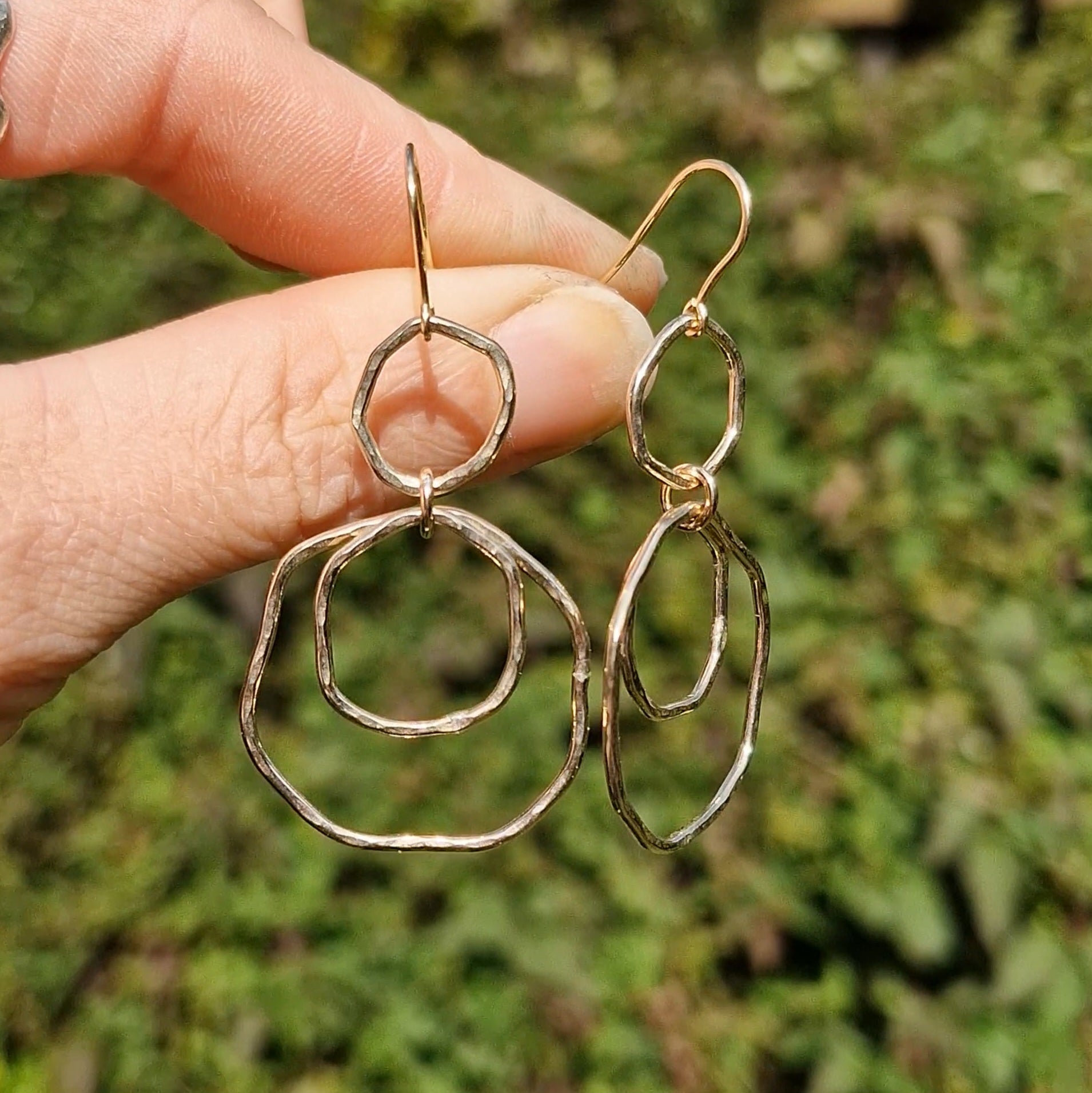 These handmade solid 9ct gold dangling earrings feature a striking ripple texture, capturing the gentle flow of water, reflecting light beautifully and creating a dynamic, radiant effect. With their bold design, they make a sophisticated and graceful statement, perfect for any special occasion.