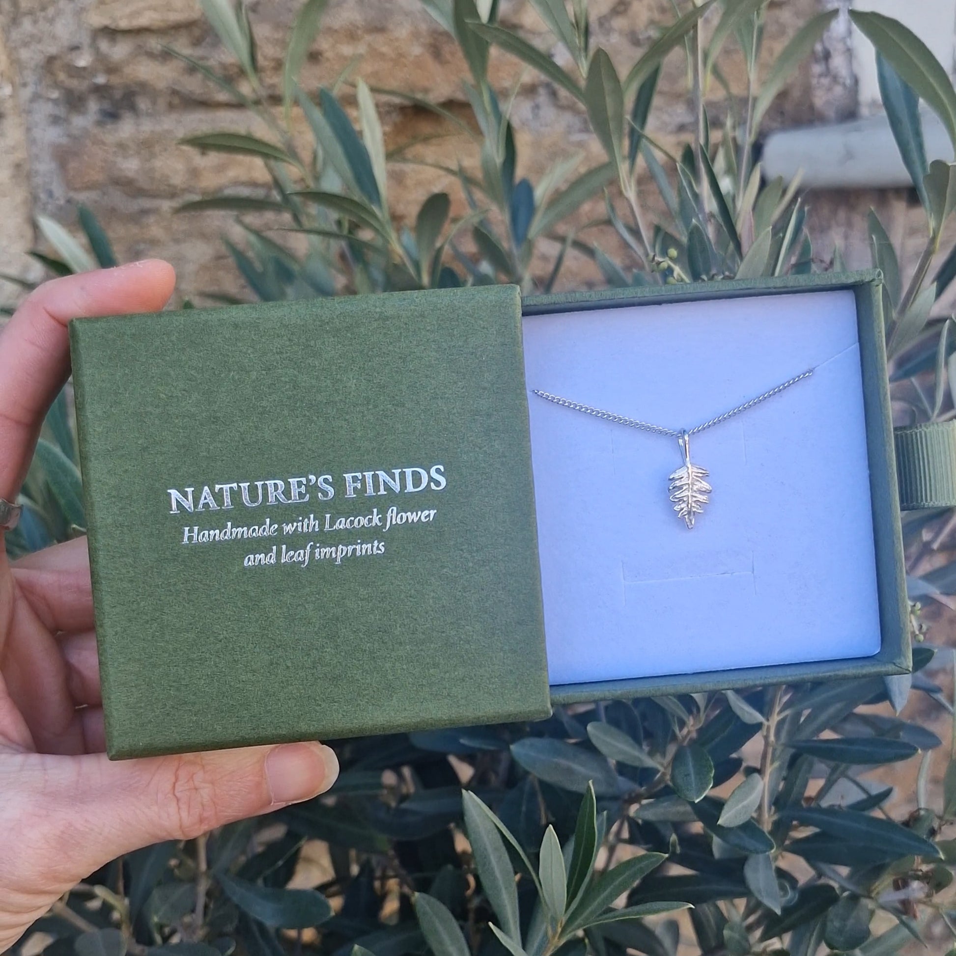 Crafted in sterling silver using an imprint from a real fern leaf plucked from the surroundings of Lacock Village, UK. The fern pendant measures approximately 10mm x 20mm on an a choice of 16", 18" or 20" chain. - please write in the box below which length chain you would like ( if left blank an 18" will be selected by default)