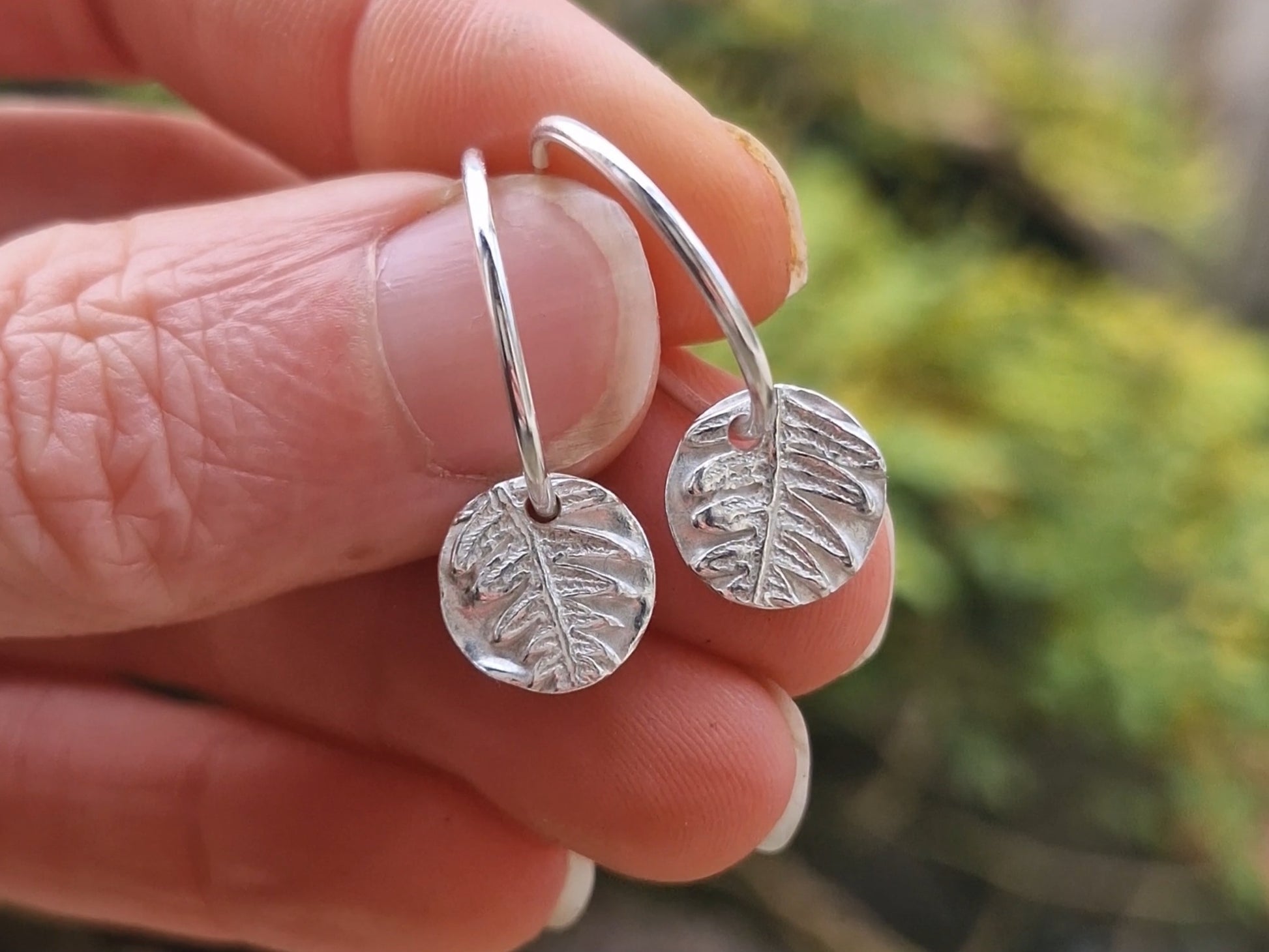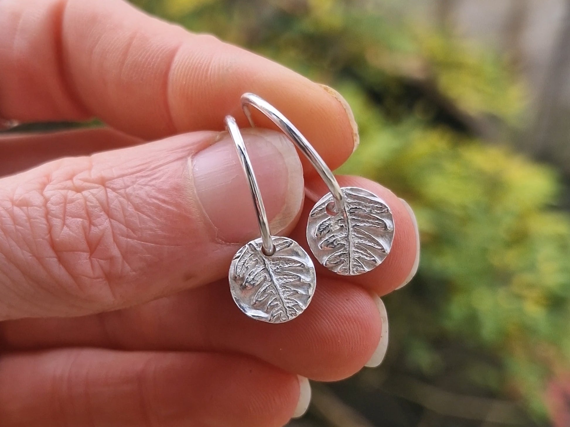 Capture nature's intricate beauty with these hoop earrings, each adorned with a genuine leaf imprint charm, ensuring every pair is a one-of-a-kind masterpiece and a testament to the beauty of nature's imperfections. Each imprint is made with pure fine silver art clay.
