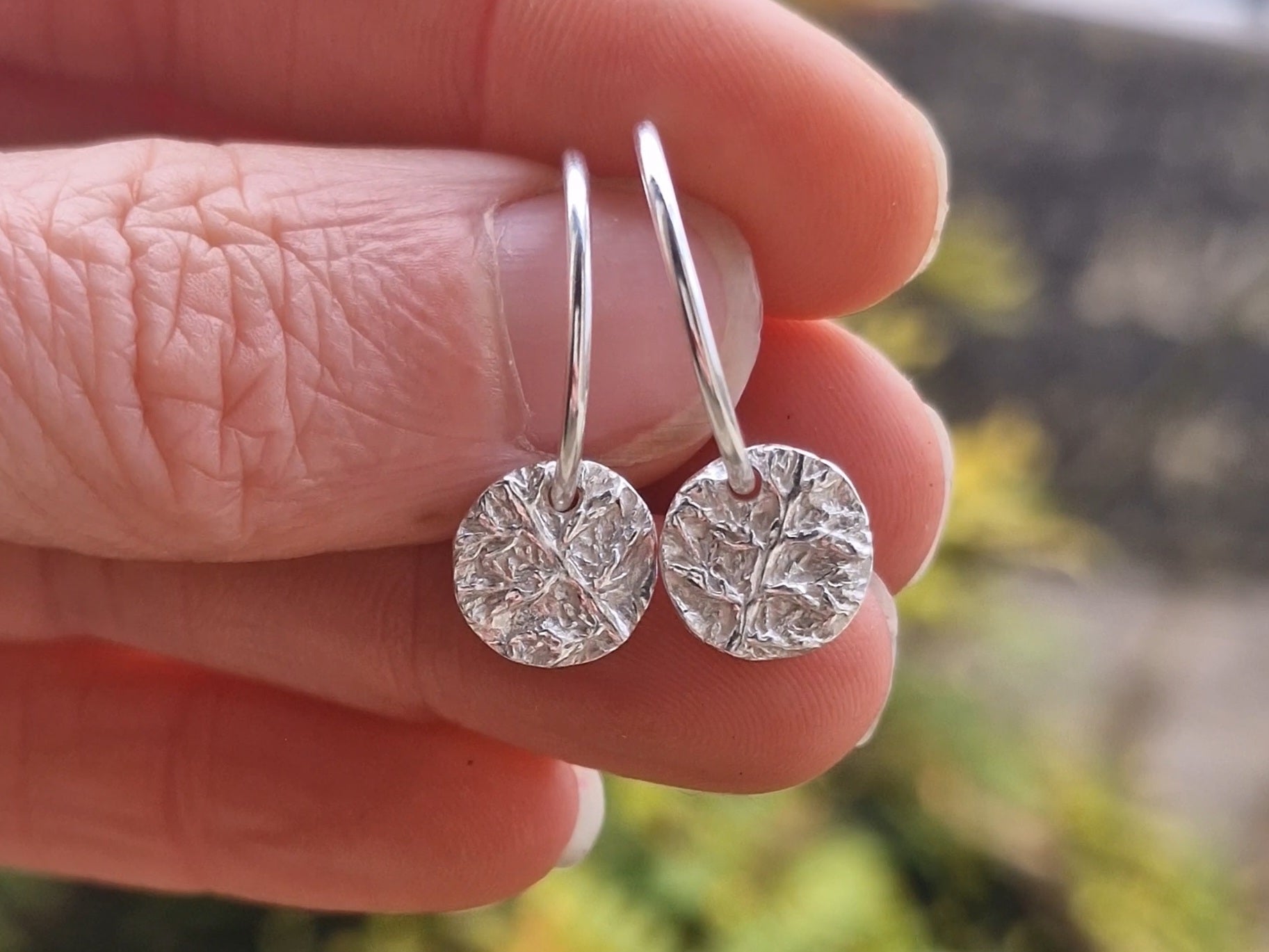 Capture nature's intricate beauty with these hoop earrings, each adorned with a genuine leaf imprint charm, ensuring every pair is a one-of-a-kind masterpiece and a testament to the beauty of nature's imperfections. Each imprint is made with pure fine silver art clay.