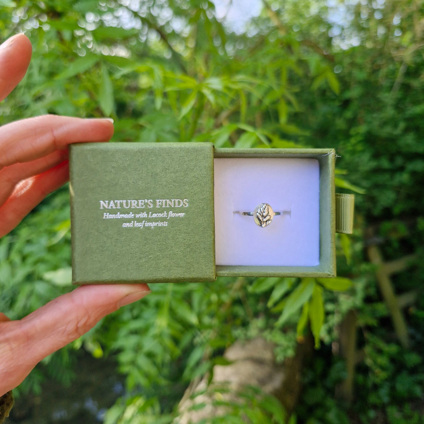 Capture nature's intricate beauty with this ring, adorned with a genuine leaf imprint, a one-of-a-kind piece and a testament to the beauty of nature's imperfections. Each imprint is made with pure fine silver art clay.