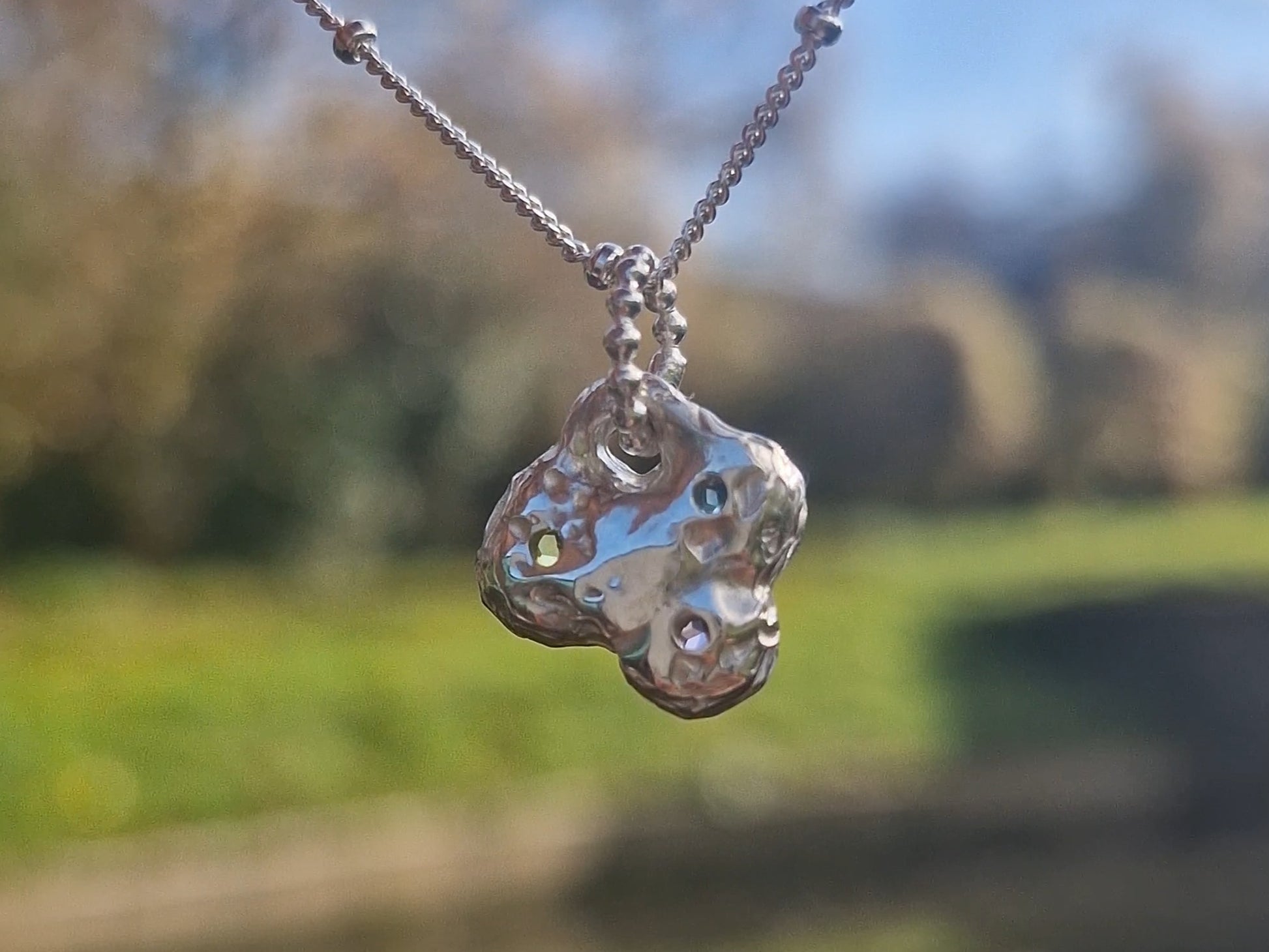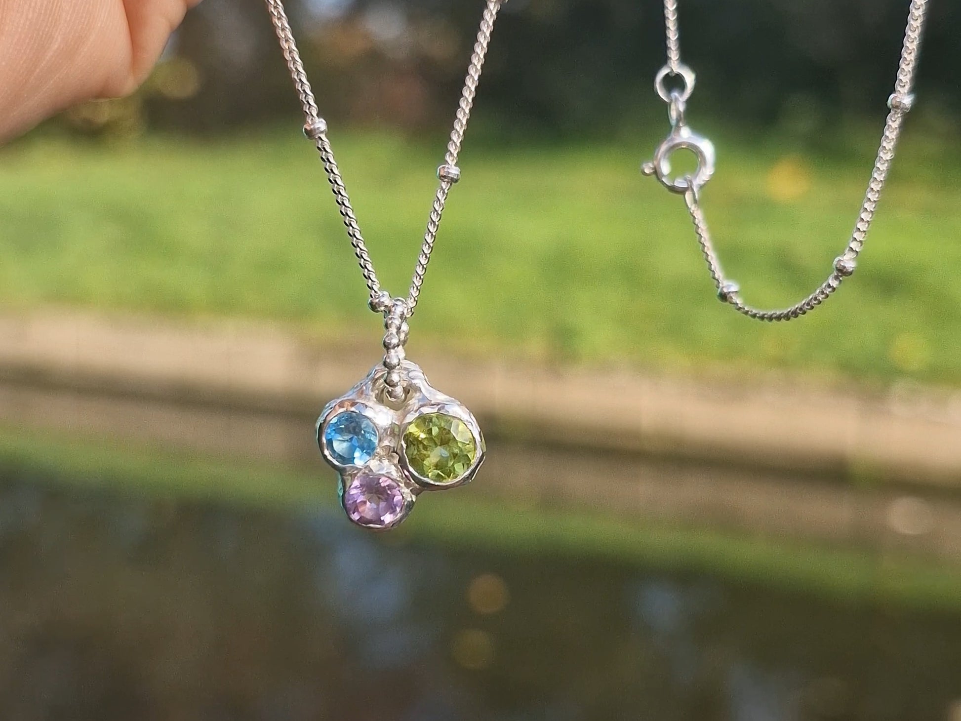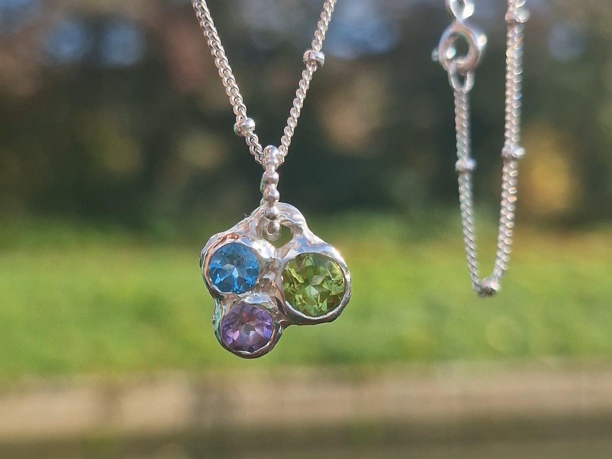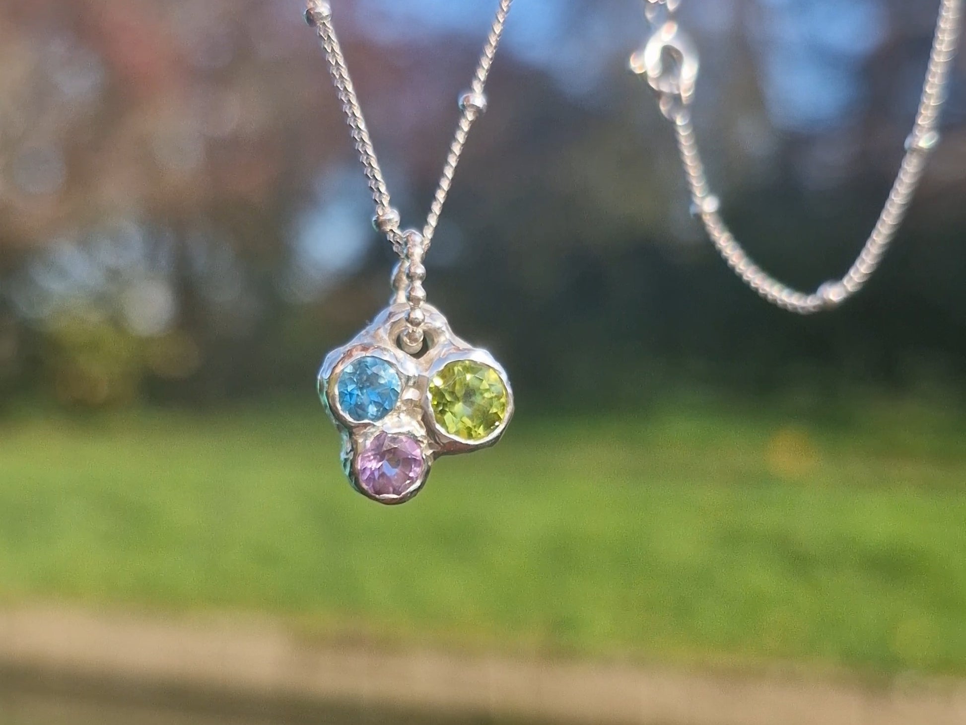 The Molten Gem Trio necklace is a sculptural piece - hand-carved in wax and cast in solid recycled sterling silver using the ancient lost wax technique. Featuring a natural green peridot, amethyst and blue topaz gemstones in a molten home.