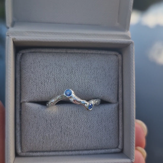 The Molten Sapphire Wave Ring is a sculptural piece - hand-carved in wax and cast in solid recycled sterling silver using the ancient lost wax technique. Featuring two 2.5mm natural Sri Lankan X/STD sapphires set on a waved band. Watch how light catches every undulating contour of this ring's molten design, creating an irresistible radiance that draws the eye and captivates at first glance.