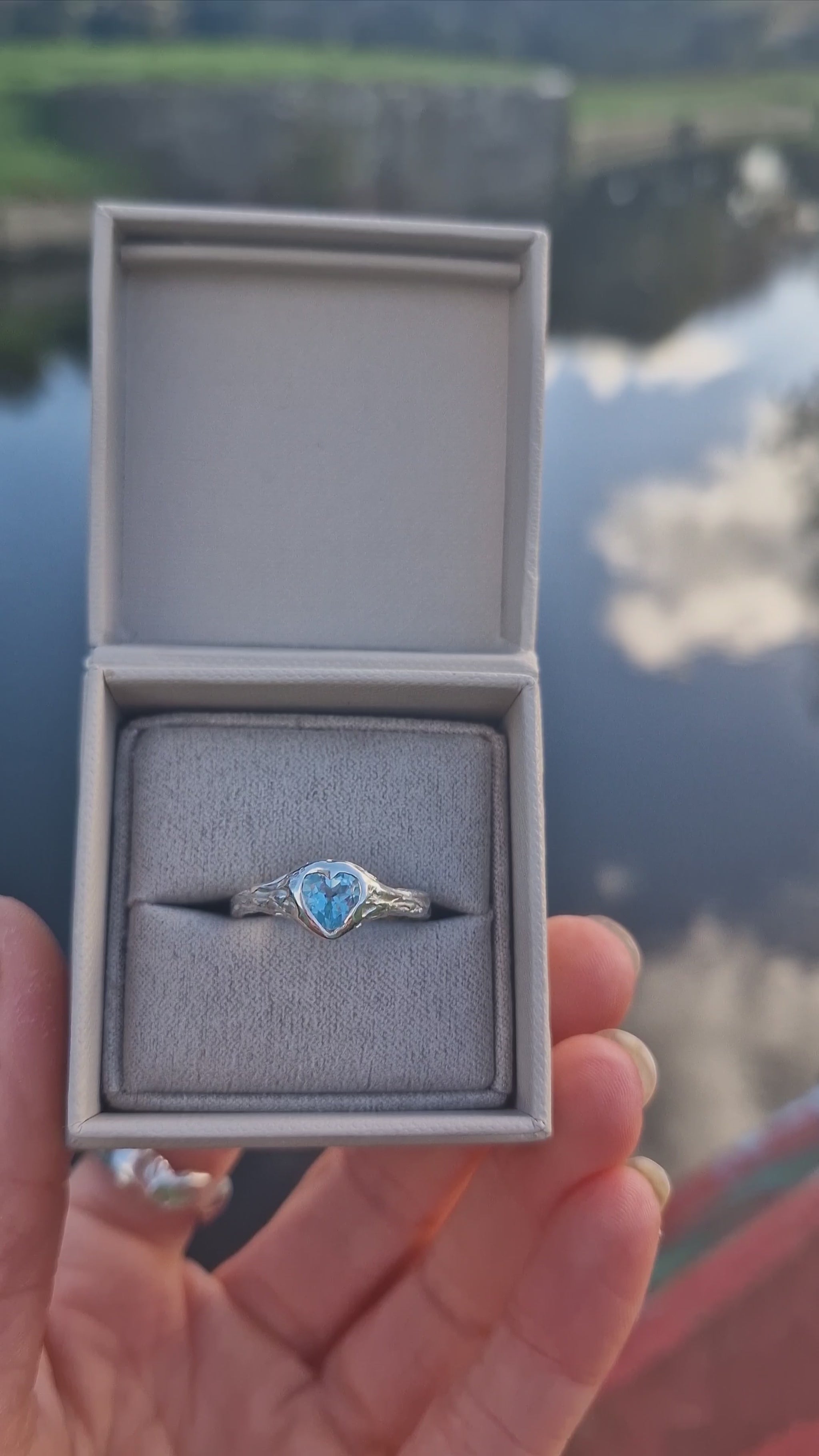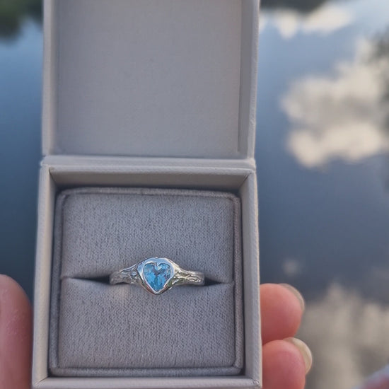 The Molten Topaz Heart Ring is a sculptural piece - hand-carved in wax and cast in solid recycled sterling silver using the ancient lost wax technique. Featuring a hearty 6mm heart shaped natural swiss blue topaz in a chunky heart band.
